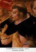 Il breviario domenicano, definisce il Beato Gundisalvo “illustre specchio dei pellegrini, degli anacoreti e dei predicatori”. Nato da illustre famiglia, fu iniziato al Sacerdozio dal suo Vescovo, l’Arcivescovo di Braga, il quale ben presto gli affidò in cura la chiesa di San Pelagio su Viscella. Desideroso di visitare i luoghi della Terra Santa, santificati dalla presenza di Gesù, vi si recò col permesso del suo Arcivescovo, lasciando l’amato gregge alle cure di un vicario. Ritornato dopo molto tempo il vicario lo respinse come un intruso e Gundisalvo, senza un lamento, si ritirò in solitudine presso Amarante, per vivervi da anacoreta. Dopo un po’ chiese alla Madonna un segno del divino beneplacito e la Vergine gli apparve ingiungendogli di farsi religioso in quell’Ordine dove il suo Piccolo Ufficio si cominciava e si chiudeva con l’Ave Maria. Gundisalvo, docile, si mise in cammino e guidato dalla Provvidenza bussò alla porta dei Frati Predicatori di Guimares dove comprese che era quello l’Ordine indicato dalla Madonna. Vestito il Santo Abito e finito il Noviziato fu dai superiori mandato di nuovo in Amarante dove evangelizzò instancabile quelle popolazioni. Riuscì pure, per utilità dei poveri viandanti, a far costruire un ponte sul fiume Tago, che scorreva rapido e pericoloso in quei pressi. Mori consunto dagli anni e dalle fatiche, adagiato sulla paglia, circondato dal suo popolo, accorso a ricevere un’ultima benedizione. La Madonna venne a prenderlo in una festa di angeli per condurlo in Cielo. Il suo corpo si trova in una cappella cittadina. Papa Clemente X il 10 luglio 1671 ha concesso la Messa e l’Ufficio propri, già permessi dal 1560 per il solo Portogallo.